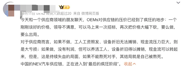 9月10日,有汽车行业博主发文称中国的NEV汽车供应链,正在进入到“最后的疯狂阶段”:一个刚刚谈好的价格,领导不满意,可以马上来一次招标,再次把价格大幅下砍,要么做,要么出局。