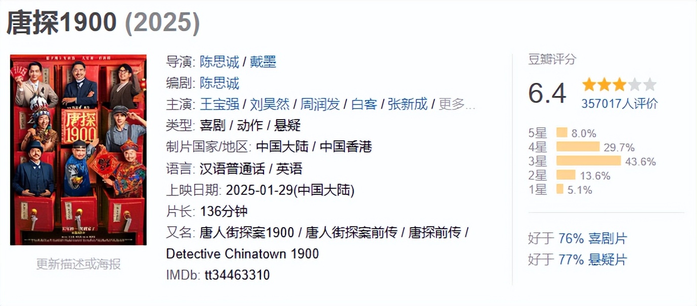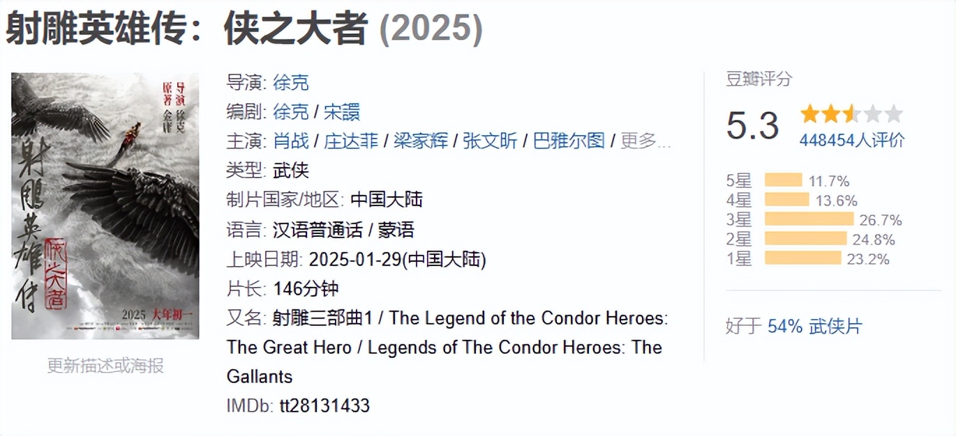 除了这部影片外,其他几部大制作电影都没有表现出应有的水准。例如,《封神2》和《射雕英雄传》都未能达到观众的期待,口碑一路下跌,豆瓣评分分别只有6.0分和5.3分,令人失望。
