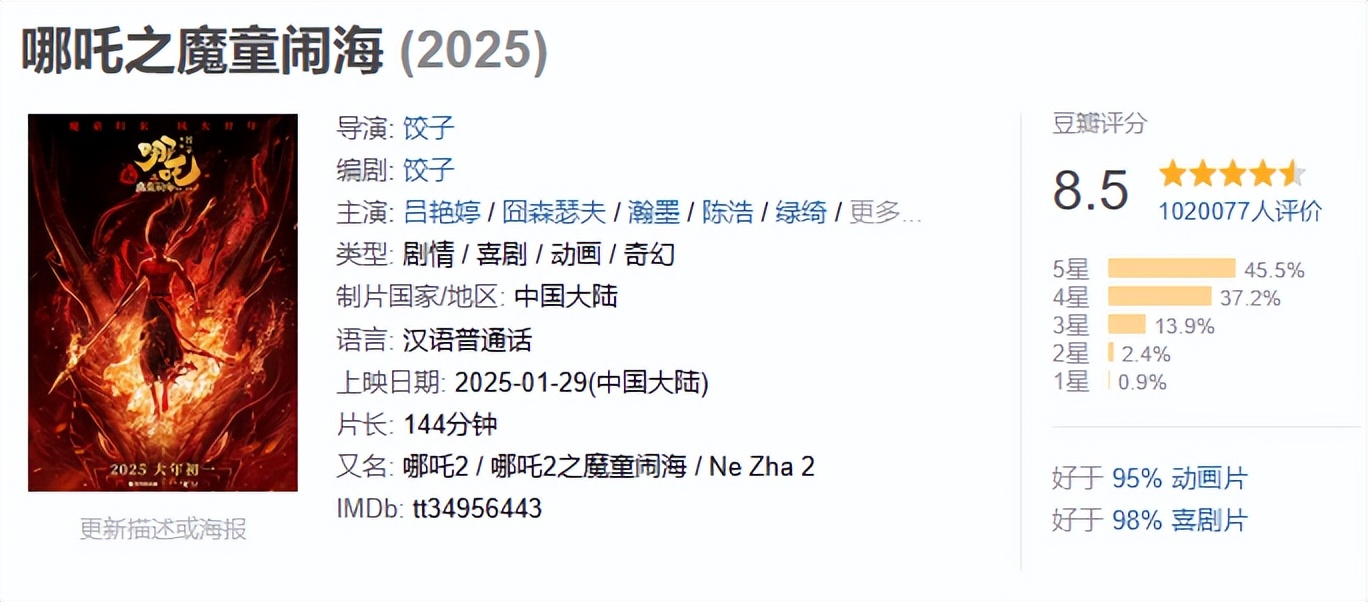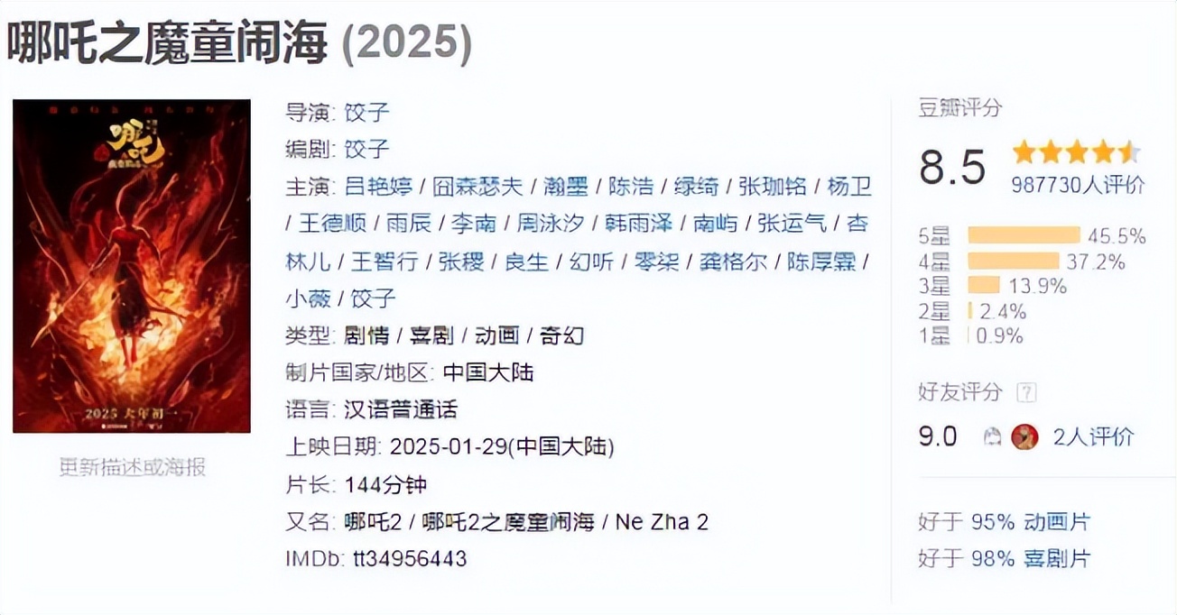 《哪吒2》从人物设计到故事情节,的确是偏向儿童向的电影,但令人惊讶的是,它在上映后,豆瓣上获得了98.7万人打出的8.5高分,远远甩开其他竞争者。