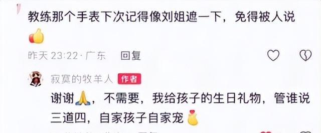 有人劝教练将手表遮一下,免得被别人说,而教练则霸气回应,这是给孩子的生日礼物,自己愿意倾尽所有宠爱他,不在乎别人说三道四。