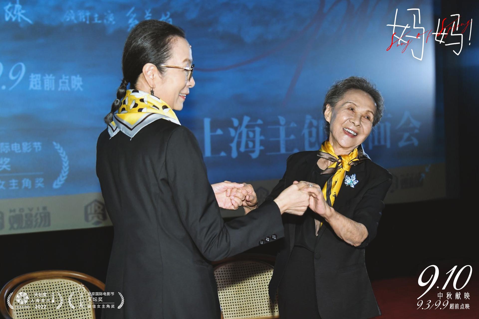 上海首映现场,天坛奖影后吴彦姝、金鸡奖影后奚美娟牵手亮相,两人不仅默契同穿黑色服饰,更亲密耳语互动,恍若电影中母女相伴情景重现,更透露出女性影人之间的惺惺相惜。两位演员更应现场观众的要求,用上海话重现片中对白,简短的三句话却饱含情感,一声“我是妈妈”令人感动赞叹。观众对两位演员片中的演技十足认可,称“绝对是殿堂级的表演”、“真实、细腻、克制”、“为大银幕上有她们这样的女演员而骄傲”、“每一个她们的镜头都如此珍贵”。