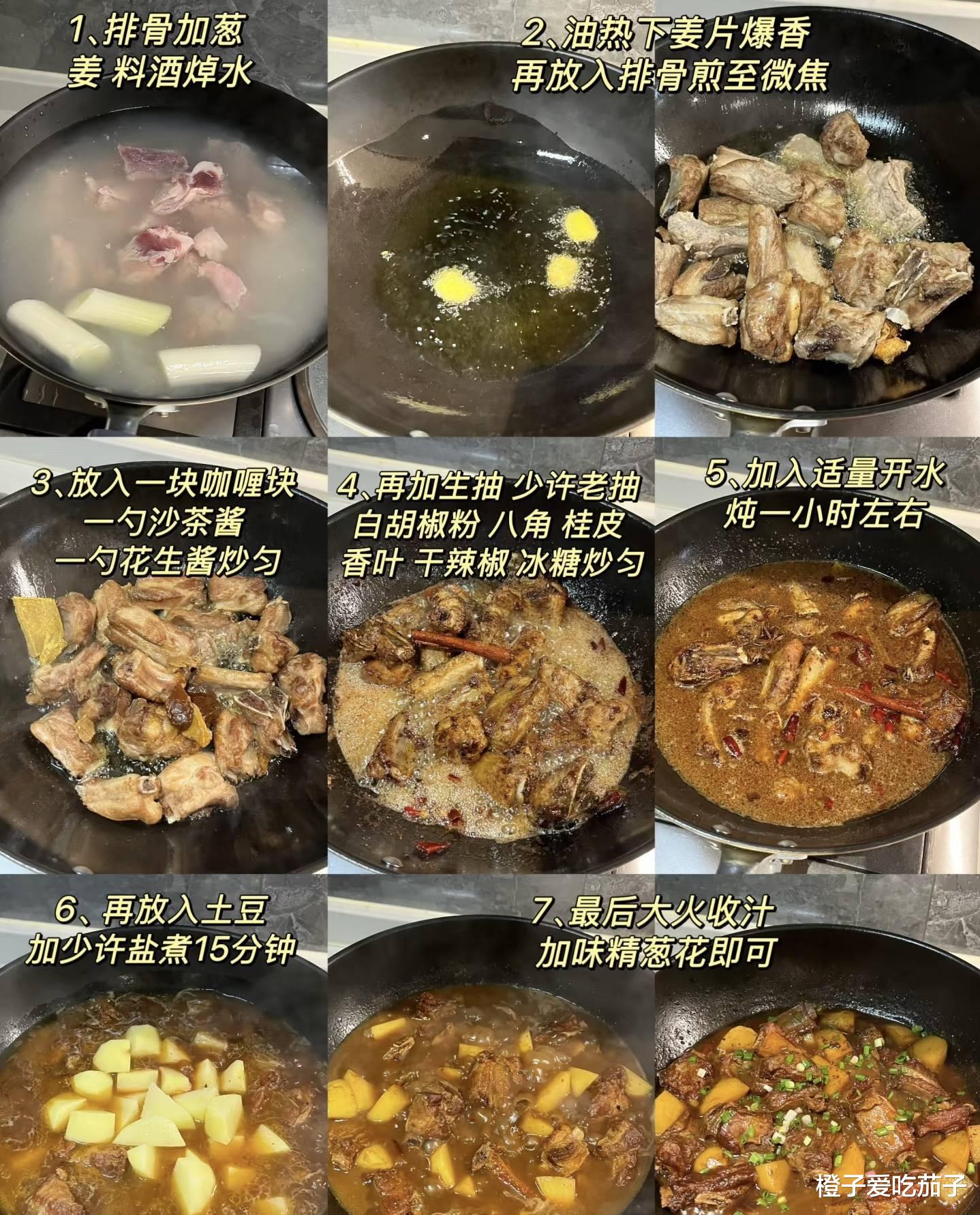 三、烹饪技巧1. **焯水去腥**:排骨焯水可以去除血水和杂质,使炖出来的排骨更加鲜嫩,没有腥味。2. **煎炸排骨**:煎炸排骨可以使排骨表面形成一层保护膜,锁住肉汁,使排骨更加鲜嫩多汁。3. **炒香咖喱粉**:炒香咖喱粉可以激发咖喱的香气,使菜肴更加美味。4. **小火慢炖**:小火慢炖可以使排骨和土豆充分吸收汤汁的味道,口感更加软糯。5. **收汁**:收汁可以使汤汁变得浓稠,增加菜肴的口感和风味。