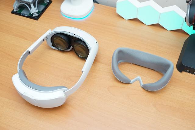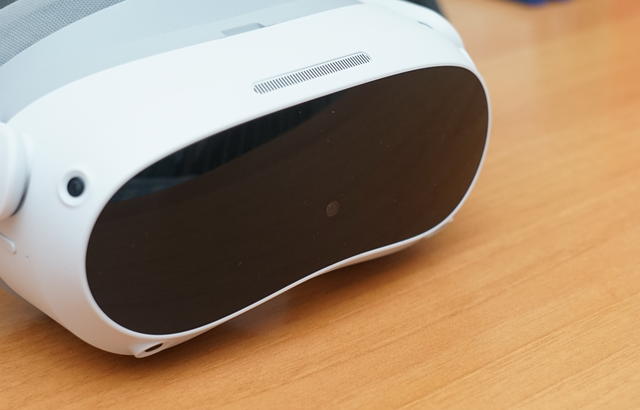 一体机正面还隐藏着一颗RGB彩色镜头,它可以帮助用户获取所处真实环境的彩色画面,这让它也成为全球第一款量产的彩色透视VR一体机。可透视的优势很多,不光可以在佩戴VR眼镜时,不会看不到眼前的障碍物,防止磕碰,但需要和旁边的人交流时,也无需频繁摘下头显,快速切换真实与虚拟世界,只需双击眼镜右侧即可。