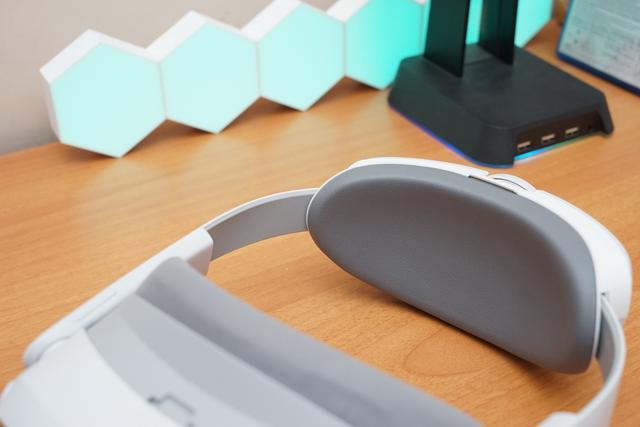后脑垫与后脑的接触部位很大,用于头部后面的支撑,这样机身的重量会均匀的分布在前后两端。头顶的可拆卸绑带还能继续分担VR一体机的重量。
