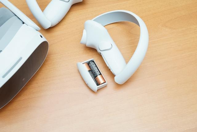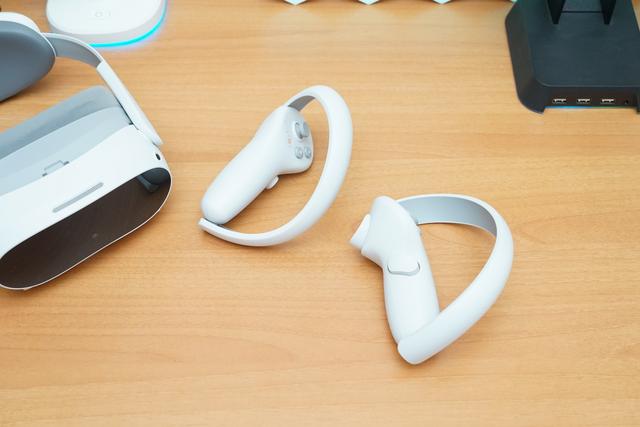 PICO 4 VR 一体机左右两只手柄是分开的,每只手柄上都有扳机键和抓握键,并可以捆绑上自带的安全绳。