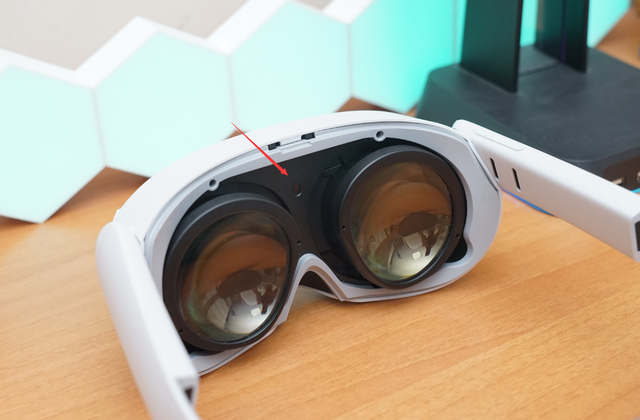 在两块屏幕中间有一个距离传感器,当检测到用户摘下头显时系统会自动休眠,重新佩戴则会自动唤醒,无需每次开关机,不光省电还提高使用的便捷。