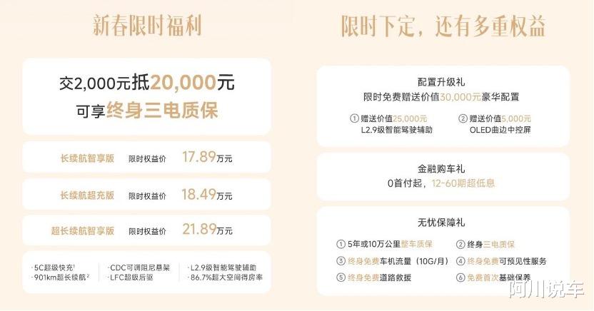 据悉,2月28日前下定岚图知音,用户还能享受“2000元抵20000元”的福利政策,17.89万起的价格就能入手。在此基础上,岚图知音官方还推出包括终身三电质保的三大购车好礼。同时,还能叠加2025年国补政策。