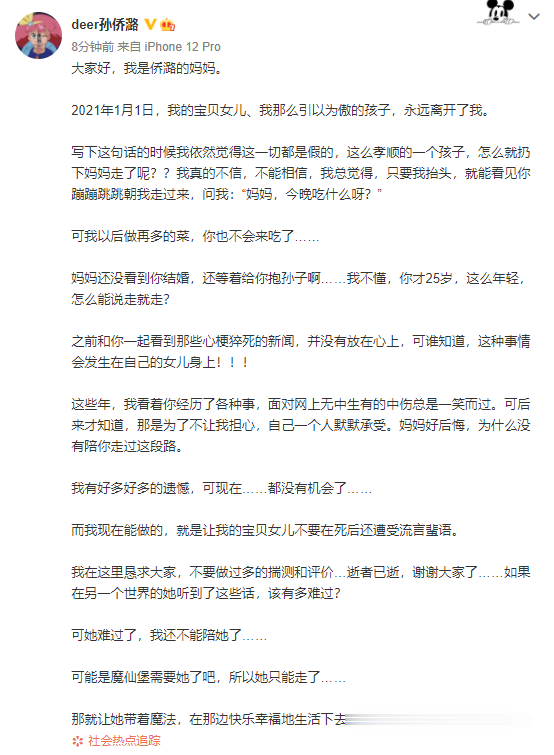 孙侨潞妈妈还表示:“我在这里恳求大家,不要做过多的揣测和评价,逝者已逝,谢谢大家了。”