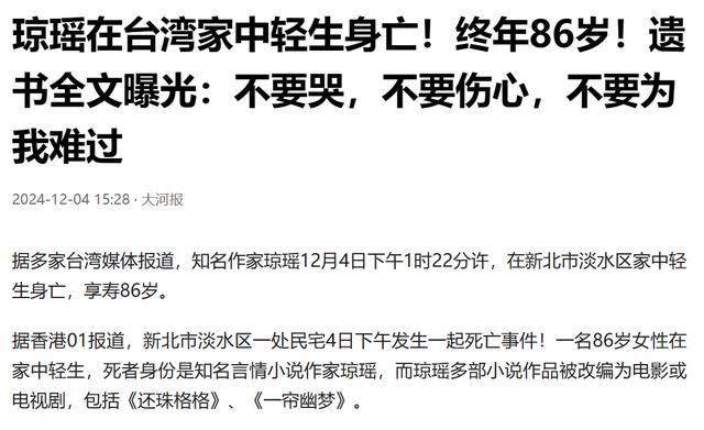 琼瑶在台湾家中轻生身亡!终年86岁!遗书全文曝光:不要哭,不要伤心,不要为我难过