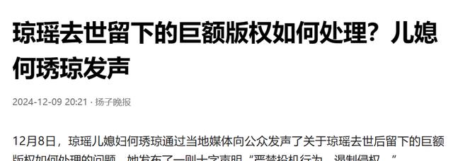琼瑶去世留下的巨额版权如何处理?儿媳何琇琼发声