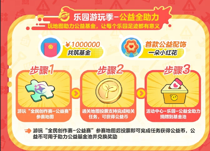 从创作者、传播者到公益赛道,《蛋仔派对》关注每一份热爱,为每个用户找到兴趣接驳点,打造真正全民狂欢。与此同时,针对全体用户的「乐园游玩季」同步推出,玩家可通过游玩参赛地图,为心仪地图投票,赢取免费专属皮肤动作,亦可以通过打卡公益赛道主题地图,获得专属公益配饰,并以公益币的形式为价值100万元的共筹公益基金贡献一份力量。