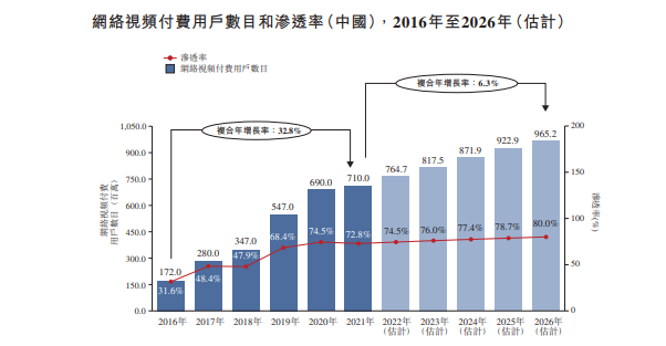 耐看娱乐招股书显示,网络视频付费用户数目由2016年的172.0百万名增至2021年的710.0百万名,复合年增长率为32.8%。2016年至2021年,网络视频付费用户渗透率由31.6%增至72.8%,预计2026年将达到80.0%。