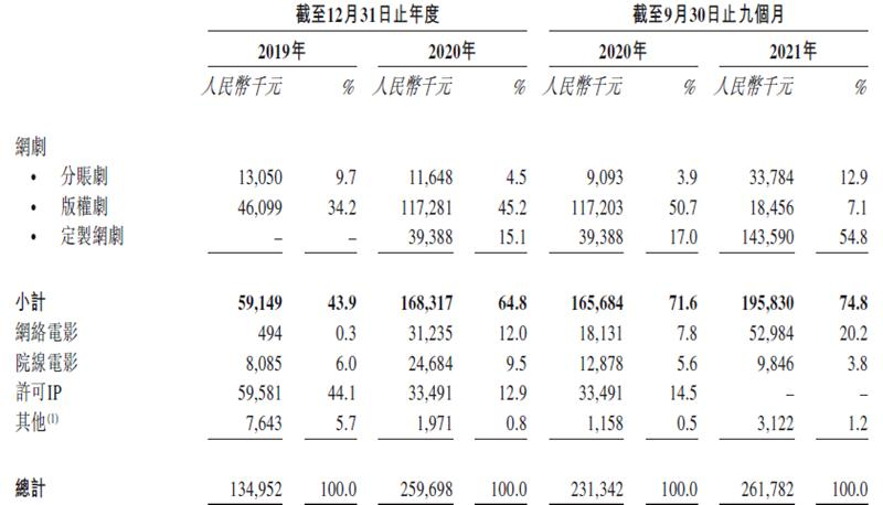 从数据上看。除2019年外,网剧成为耐看娱乐最大的业务,2021年贡献了76%的收益,达到2.63亿元(人民币,下同),含分账剧、版权剧及定制剧。且76%占比中,有60.2%来自定制剧。
