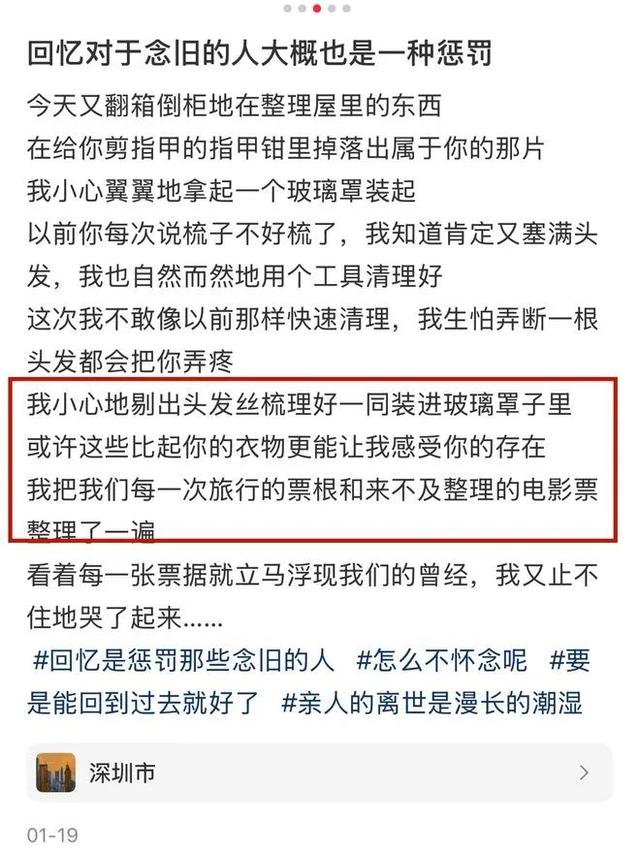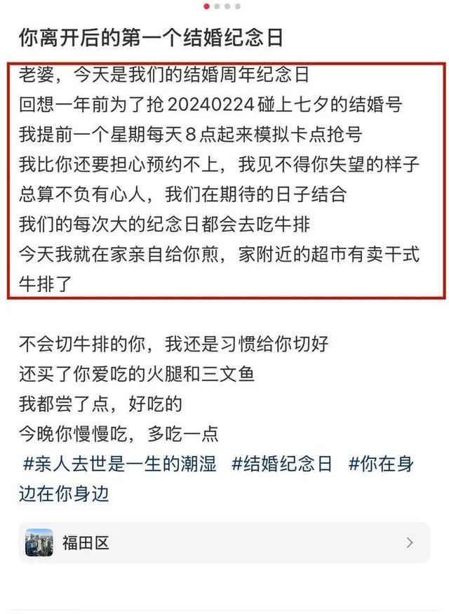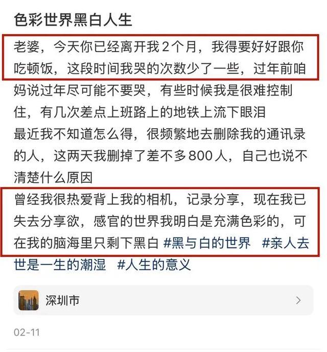 一桩桩、一幕幕,全是他对妻子满满的爱啊,看到这些,谁能不被感动得稀里哗啦的。不过,从另一个角度看,也能发现谢家振的情绪状态其实不太好。