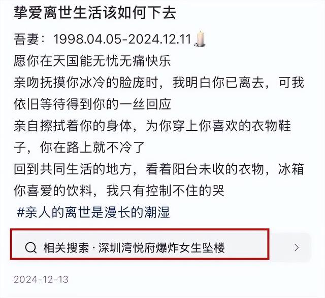咱再深挖一下,从相关搜索里发现,谢家振的妻子好像是因为意外离世的,听说跟深圳湾悦府爆炸后,女生坠楼这事儿有关。