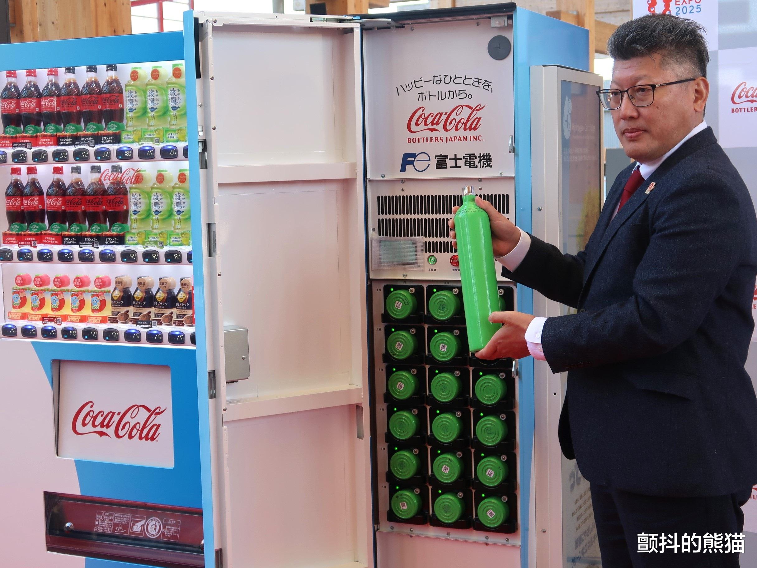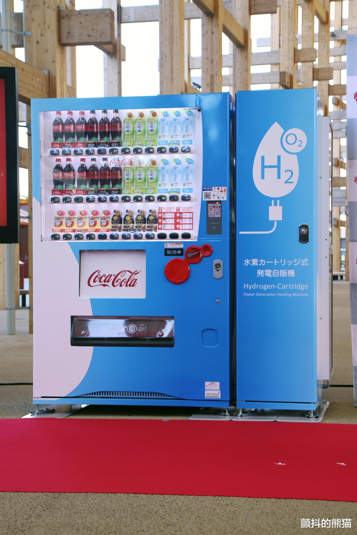 这是世界首台“氢燃料自动售货机”。该售货机通过空气中的氧气与氢气发生化学反应进行自发电,并利用产生的电力运行。其运行时的二氧化碳排放量为零,且耗电量仅为普通自动售货机的一半,对环境十分友好。