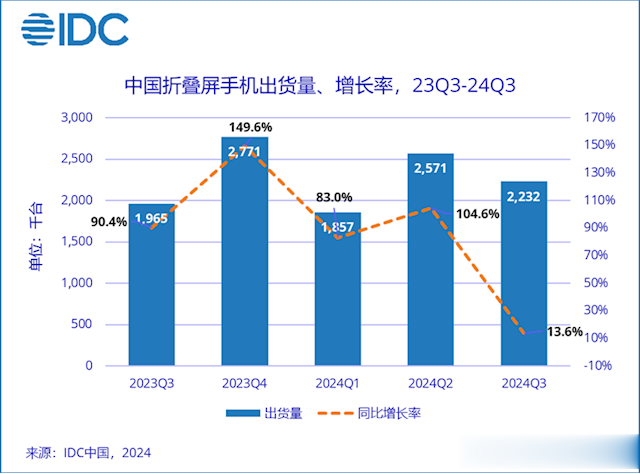 近日,市场调研机构IDC发布最新数据报告,2024年第三季度,中国折叠屏手机出货量达到223万台。虽然保持同比增长,但增速相比前八个季度明显放缓。