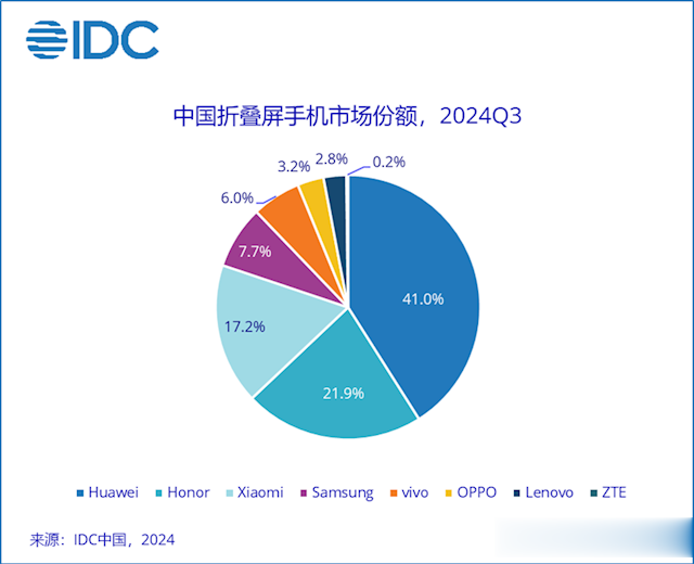 今年第三季度,华为稳居中国折叠屏手机市场份额第一,达41.0%,实现断层式领先。