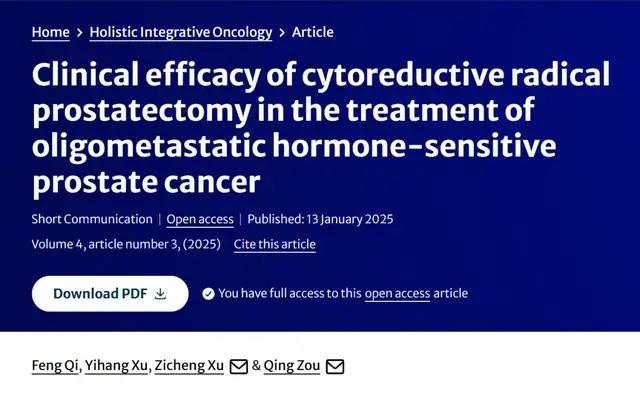 引用格式:Qi, F., Xu, Y., Xu, Z. et al. Clinical efficacy of cytoreductive radical prostatectomy in the treatment of oligometastatic hormone-sensitive prostate cancer. Holist Integ Oncol 4, 3 (2025). https://doi.org/10.1007/s44178-024-00146-0