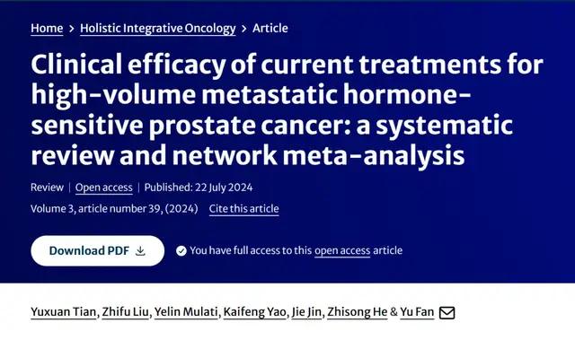引用格式:Tian, Y., Liu, Z., Mulati, Y. et al. Clinical efficacy of current treatments for high-volume metastatic hormone-sensitive prostate cancer: a systematic review and network meta-analysis. Holist Integ Oncol 3, 39 (2024).https://doi.org/10.1007/s44178-024-00106-8