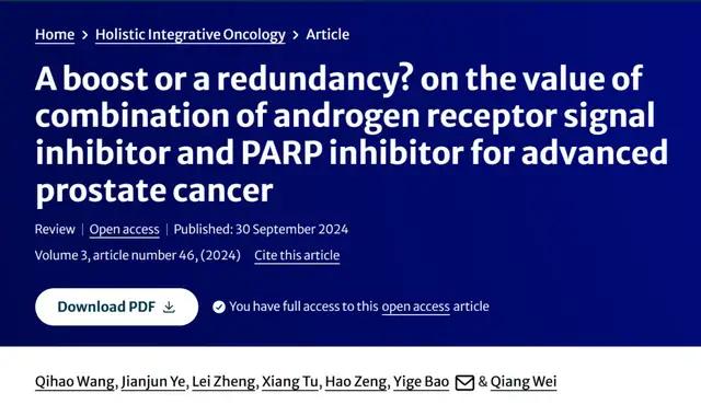 引用格式:Wang, Q., Ye, J., Zheng, L. et al. A boost or a redundancy? on the value of combination of androgen receptor signal inhibitor and PARP inhibitor for advanced prostate cancer. Holist Integ Oncol 3, 46 (2024).https://doi.org/10.1007/s44178-024-00119-3