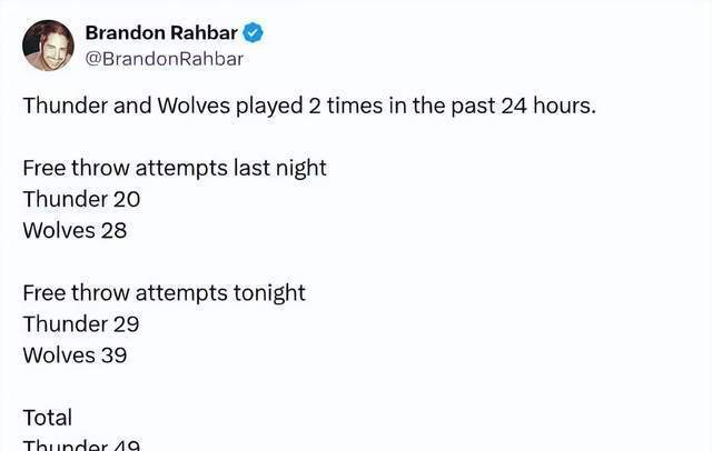 面对芬奇的质疑,雷霆记者布兰登-拉赫巴迅速用数据予以反驳。他列举了过去两场比赛中雷霆和森林狼的罚球次数对比,试图证明亚历山大的罚球数据并非异常。尽管如此,亚历山大的高罚球数仍然成为比赛的焦点之一。