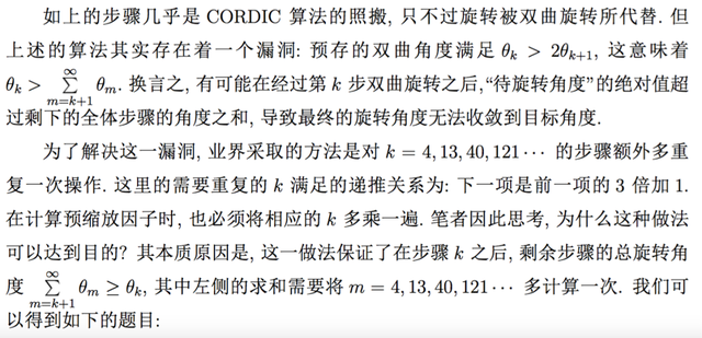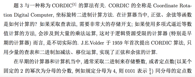 这道题目背景是计算机领域中的坐标旋转数字计算算法(下面的内容中称作坐标旋转二进制计算方法)。下面就分析一下这道题目是如何命制并给出该题目的解法,其中的内容摘录清华大学集成电路学院一位老师的文章:
