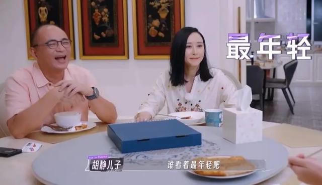 爸爸小声问,家里谁最凶?儿子很有默契地偷偷指妈妈。胡静问他爷俩嘀咕什么,儿子很机智,说:我们在讨论谁看着最年轻。