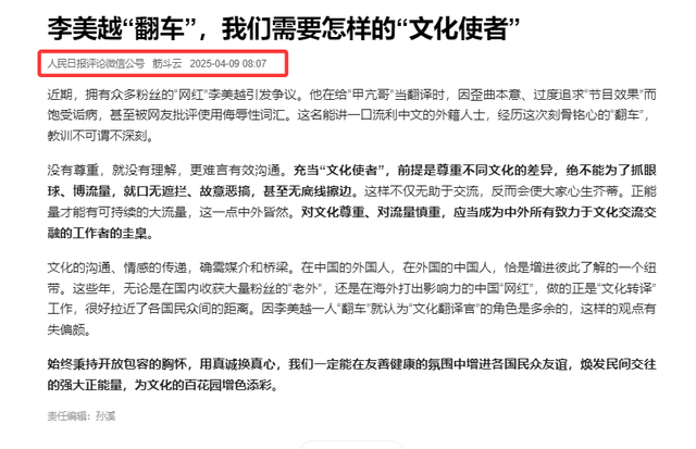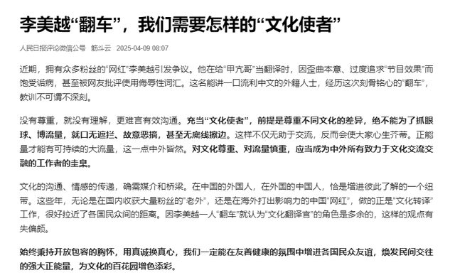同样李美越也被人民日报评价“翻车”,我们真正需要的是尊重不同文化的差异的文化使者。