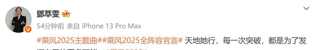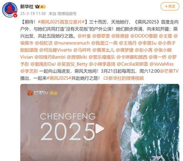 就在前一天,也就是3月19日,那档超火的综艺节目《乘风2025》抛出了一个超级重磅的东西——首发立意片:三十而历,天地她行。哇塞,这立意听起来就超级带感,仿佛能透过这简单的几个字看到节目里满满的精彩故事和无限可能呢。你知道吗?这次《乘风2025》可不得了,它就像一个勇敢的探险家,首次迈向了户外的广阔天地,打算和一群魅力四射的姐姐们一起打造一场前所未有的户外公演,这公演简直就是“没有天花板”的存在,充满了无尽的想象空间和惊喜的可能。
