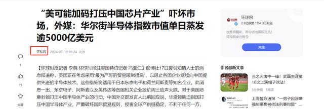 信息来源:环球网2024年7月19日——“美可能加码打压中国芯片产业”吓坏市场,外媒:华尔街半导体指数市值单日蒸发逾5000亿美元