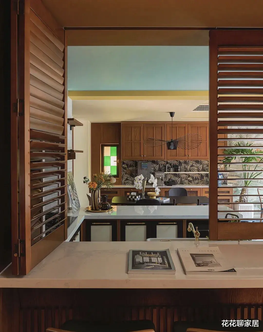 过道的设计十分有特色,它巧妙地连接了客厅和餐厨区域。一侧装有木质百叶窗,当光线透过时,变得格外柔和,同时为这个空间增添了丰富的层次感。在自然光的映衬下,过道不仅显得通透,还充满了温馨的氛围。