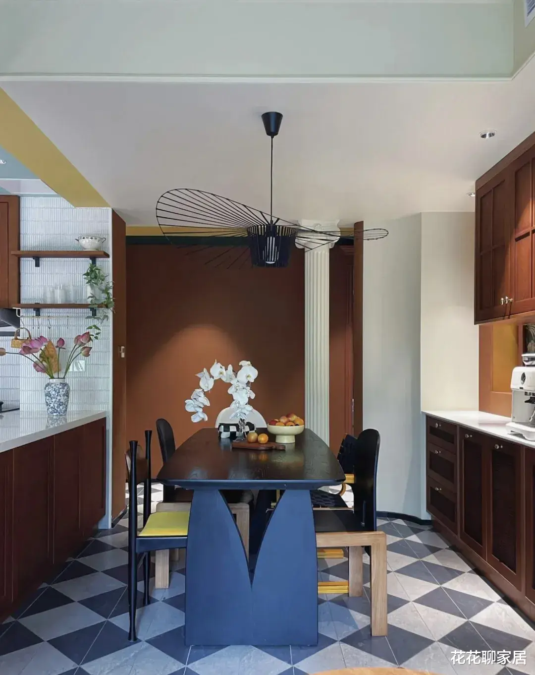 餐桌的黑色桌腿设计十分独特,为整个空间增添了一抹艺术气息。黑色的桌面与木质的长凳和椅子相搭配,整体风格简洁而大气。尤其是椅子上那抹黄色的坐垫,不仅为餐厅注入了活力,还成为了一个亮眼的点缀,有效避免了空间的沉闷感。