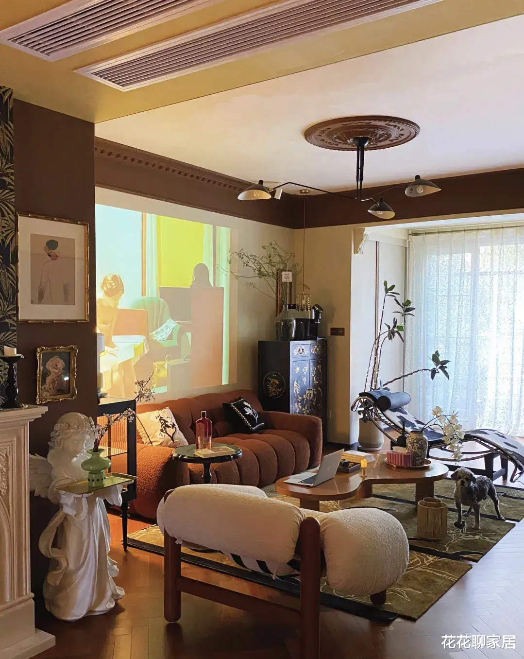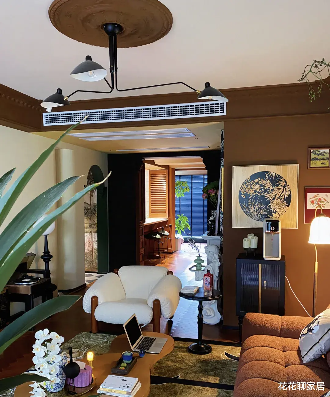 这间房子给人的感觉特别暖和舒服,而且设计上既精致又时髦。墙是棕白两色的,看着既舒服又有格调。天花板上有个黑色的三灯头吊灯,样子挺特别的,跟上面的雕花装饰很配,既有老式的优雅,又不缺现代的时尚感。