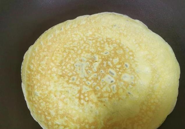从正面看到蛋液全部凝固,边上最薄的地方翘起,就改最小火慢慢晃锅,用锅铲贴锅底把蛋皮翻起,一个完整又漂亮的蛋皮就做好了,反面过来稍稍加温蛋收即可。