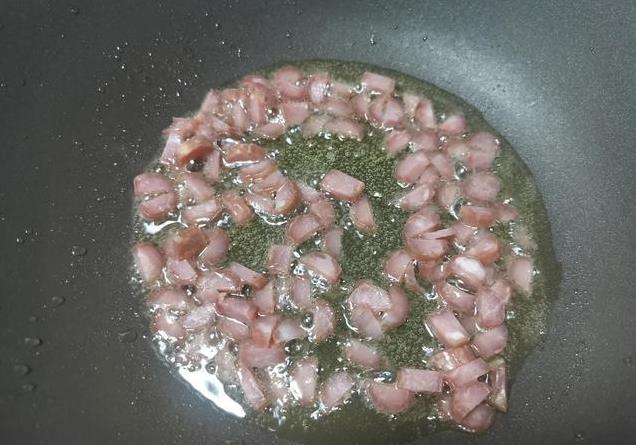 锅里倒一些比平时炒菜多一点的油量,炒熟腊肠;