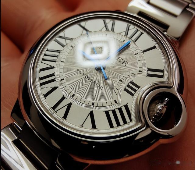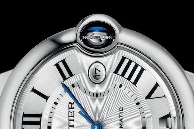 蓝气球的表盘非常具有辨识度:扭索饰纹表盘,罗马数字,铁轨状分钟圈,蓝色剑形精钢指针,与Cartier的审美传统一脉相承。由于表冠的影响,罗马数字偏离了一般的圆形轨道,向内凹进。