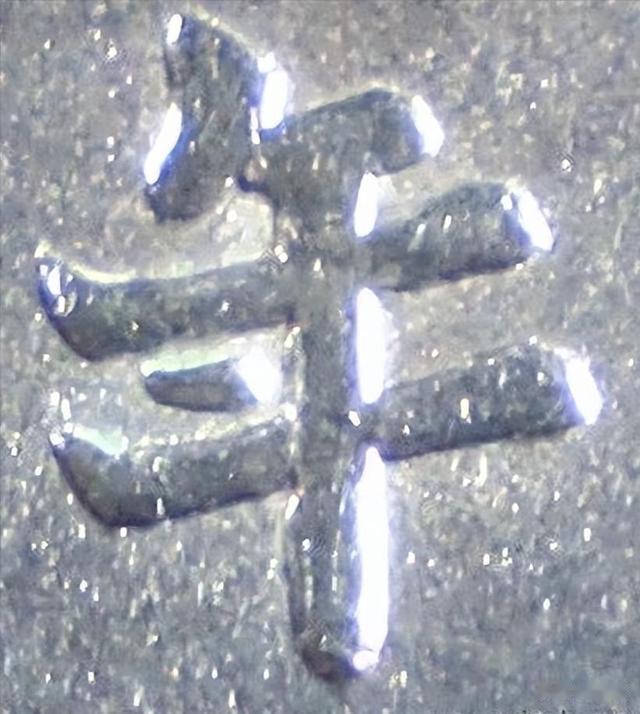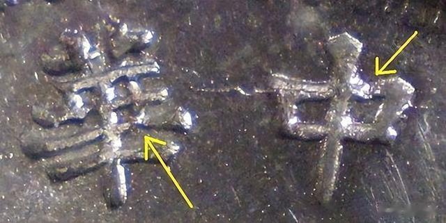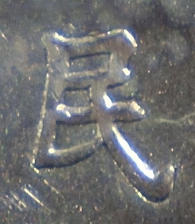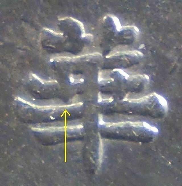 此图片是最近的拍卖转载的,品相以九年大 头来说算差的了,但成交价却也不低,是1千 人民币,约合台币近5千,我个人非常愿意有 这种版式,也相信拍卖公司买的钱币一定没 问题,但这枚九年的缺口造字却让我有一个 疑问,那就是为什么那造字的口部里颜色与 其它地方不一样?而且还有很明显的磨擦痕迹,此放大图片本人有刻意加深颜色及对比, 这也是为了让各位看清楚那痕迹而已,这也 仅代表我个人的疑问而已,为了不引起不必 要的事端,特提供网址如下,请各位自行作判 断,也如上述所说的,我愿意相信有这版式。