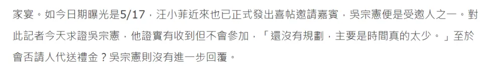 连综艺大佬吴宗宪都在受邀名单里,不过人家说了,那天正好有事去不了。至于礼金给多少,吴宗宪倒是只字不提。
