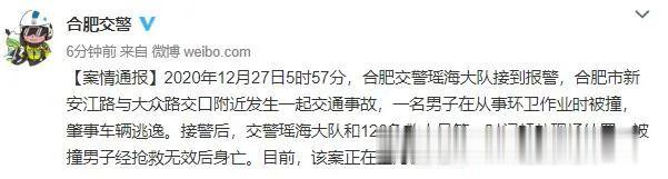 2020年12月27日5时57分,合肥交警瑶海大队接到报警,合肥市新安江路与大众路交口附近发生一起交通事故,一名男子在从事环卫作业时被撞, 肇 事车辆逃逸 。接警后,交警瑶海大队和120急救人员第一时间赶赴现场处置,被撞男子经抢救无效后身亡。目前,该案正在全力侦办中。