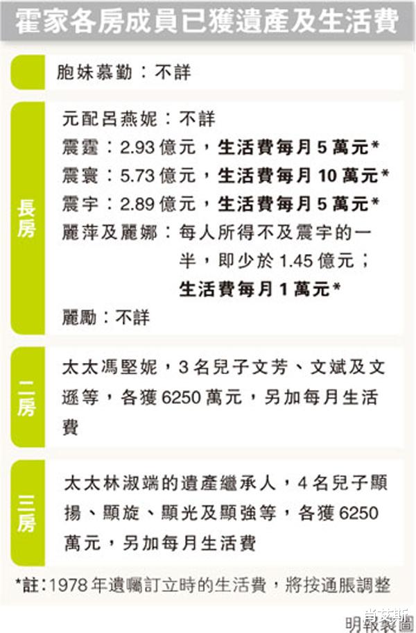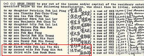 按照1971年香港法律废除一夫多妻制来看,三位太太都算明媒正娶与合法,但霍英东明显对冯坚妮较为偏心。一来林淑端与四个儿子没有登上讣闻的资格,直到90年代才被承认;二来在财产安排的英文记录中,林淑端未跟吕燕妮和冯坚妮一样冠上霍英东的姓氏“Fox”。