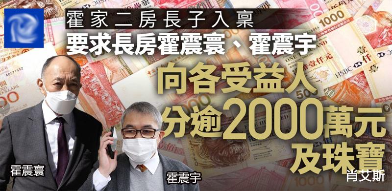 在霍文芳起诉长房之前,霍震寰和霍震宇曾经有过纷争,拉锯战持续了十多年。源于霍震宇直指霍震寰吞家族财产,要求撤换遗产执行人,这里面有一项指控便是擅自将控制的9000万珠宝分配给三房成员。好在两兄弟已达成和解。霍文芳入禀高院的诉求,正是要求霍震寰与霍震宇根据和解协议将涉及的珠宝分给他们,并向每名遗产受益人分发2500万。