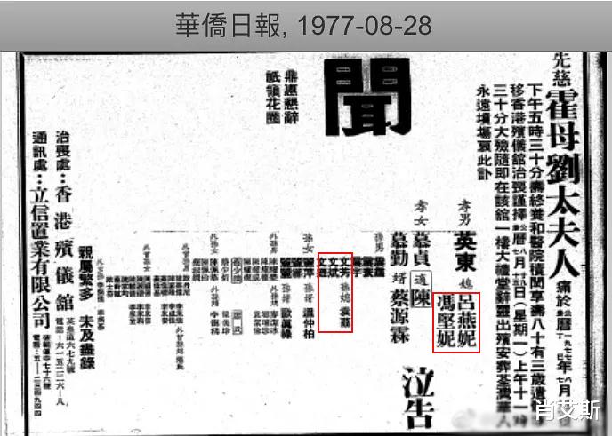 时间来到1977年8月28日,霍英东的母亲刘三在香港养和医院去世,孝顺的霍英东为母亲举办了盛大葬礼,好友李嘉诚、何鸿燊、郑裕彤等人悉数前来。而刊登在华侨日报上的一则讣闻让外界第一次得知霍英东有两房太太:吕燕妮和冯坚妮,也是首次承认冯坚妮的正式身份。