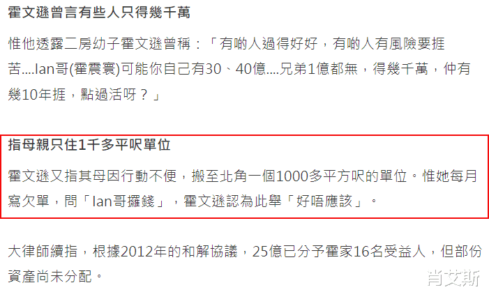 截止到目前,这宗案件尚未排期,不知道霍文芳的小算盘能否打得响?不过据霍文逊说,冯坚妮近些年因行动不便,搬至北角一个1000多平方尺的单位,每月得写欠条找霍震寰拿钱,他认为此举“好唔应该”。到底是为母亲还是为自己,只有霍文芳心里最清楚了。