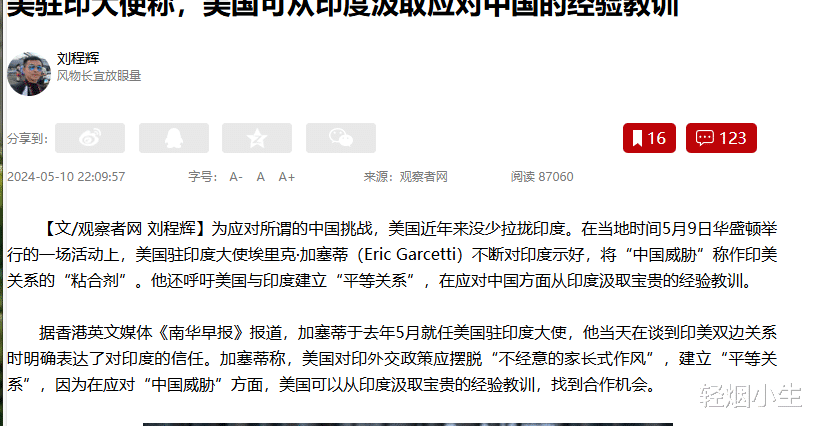 信息来源: 观察者网 2024年05月10日 美驻印大使称,美国可从印度汲取应对中国的经验教训