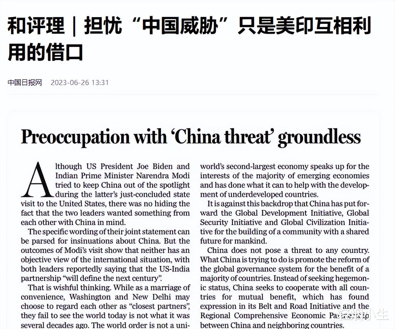 信息来源: 中国日报网 2023年06月26日 和评理|担忧“中国威胁”只是美印互相利用的借口