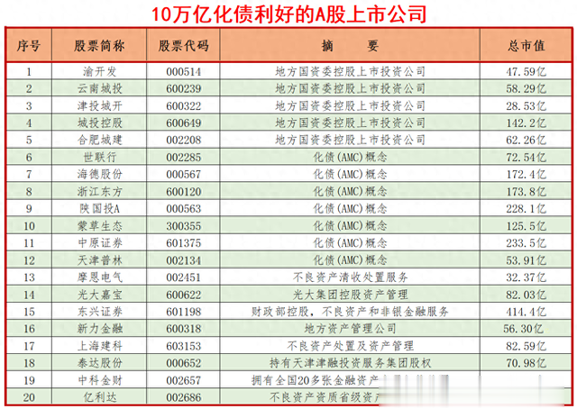 (2)化债概念上市公司。化债压力减小,有助公司的经营活动能力,促进企业增收增利。