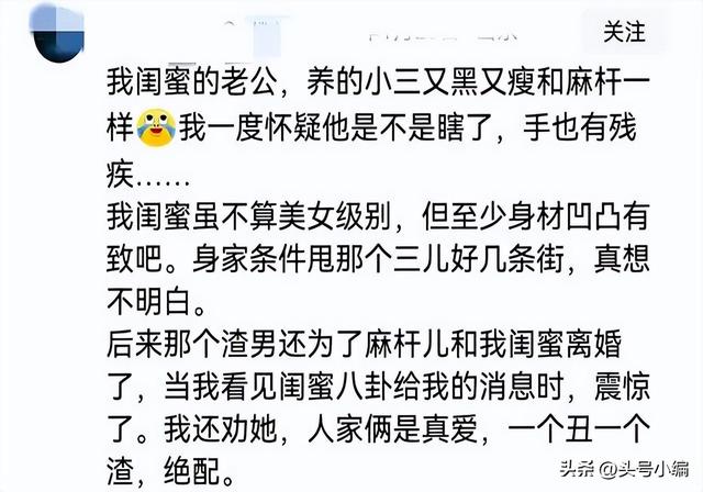 有人认为,“黄脸婆”式的小三,弱化了对受害者的同情,甚至有为出轨行为开脱的嫌疑。