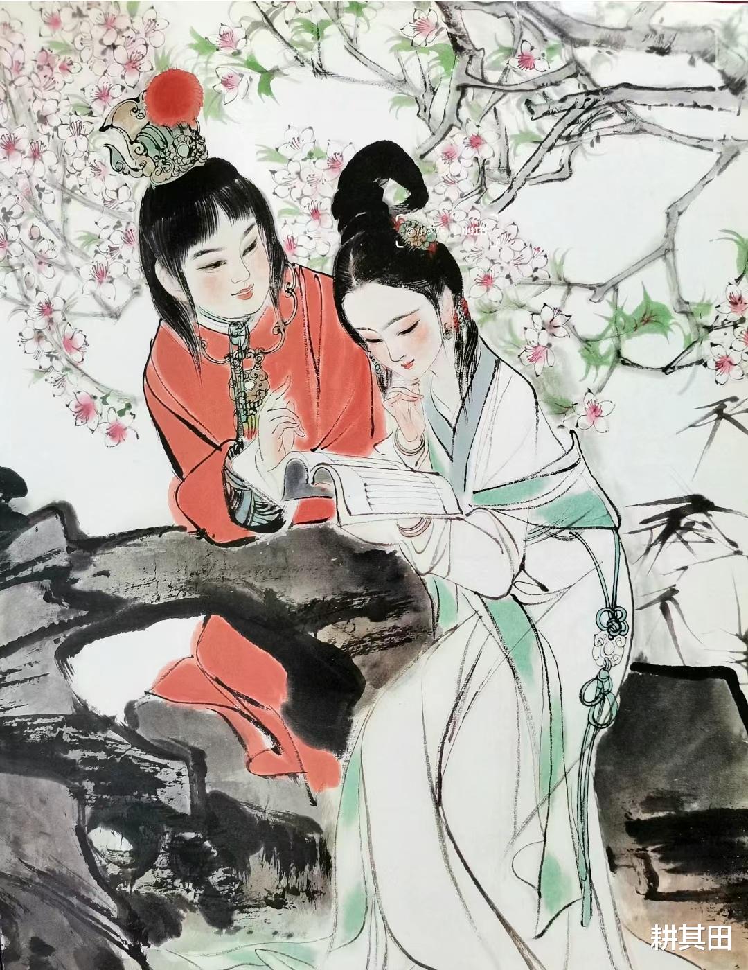 春三月,宝玉、黛玉两人在落红成阵的桃树下共读了《西厢记》,宝玉自比“多愁多病的身”,黛玉是那“倾国倾城的貌”。