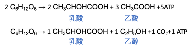 有些葡萄糖分解过程中不是产生两个丙酮酸,而是裂解为四碳糖(后续转变为五碳糖)和乙酰磷酸(HK途径),或者脱羧产生五碳糖后裂解为3-磷酸-甘油醛(后转变为丙酮酸)和乙酰磷酸(PK途径)。其中丙酮酸可以产生乳酸,而乙酰磷酸可以接受【H】产生乙醇,或者经过氧化产生乙酸。